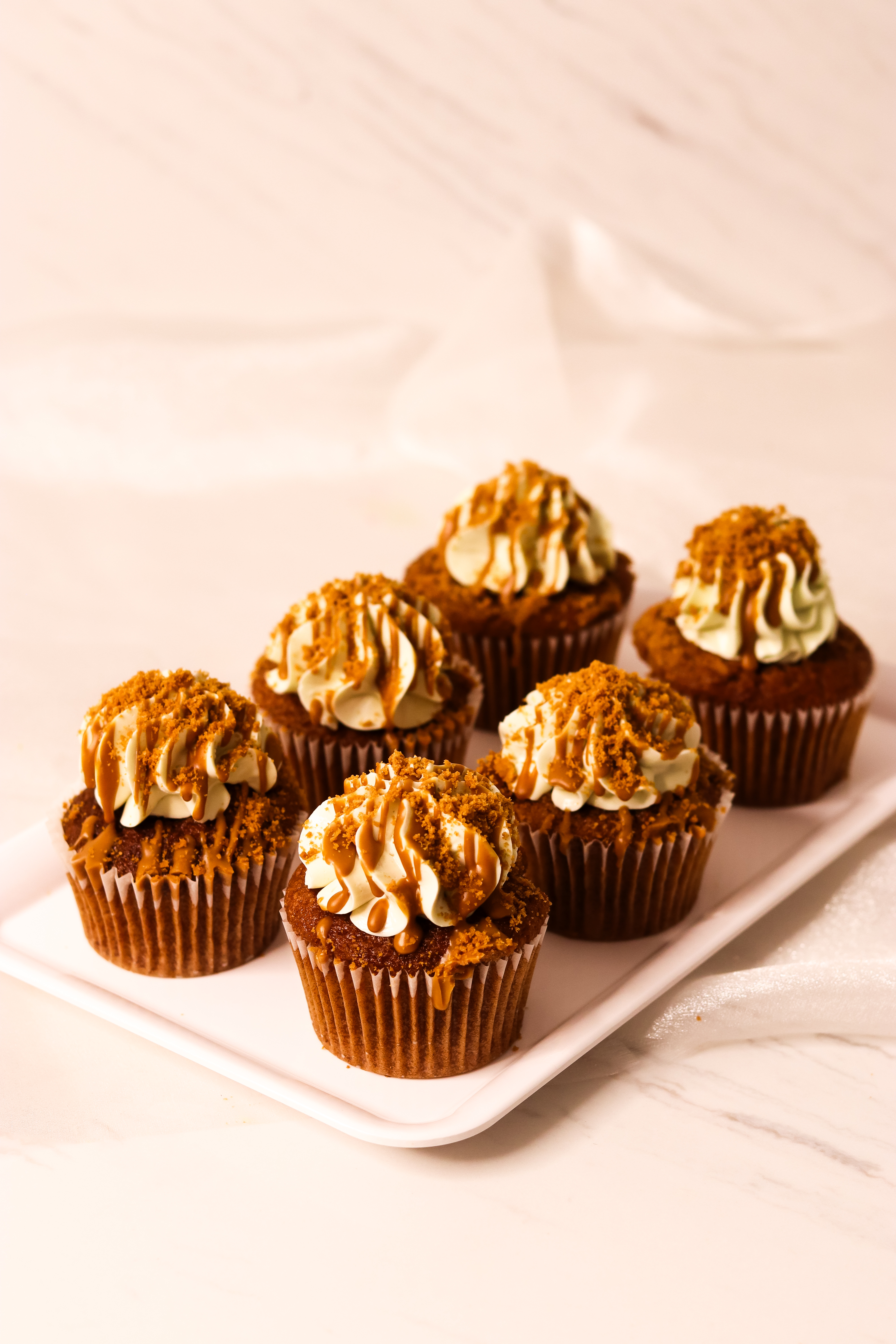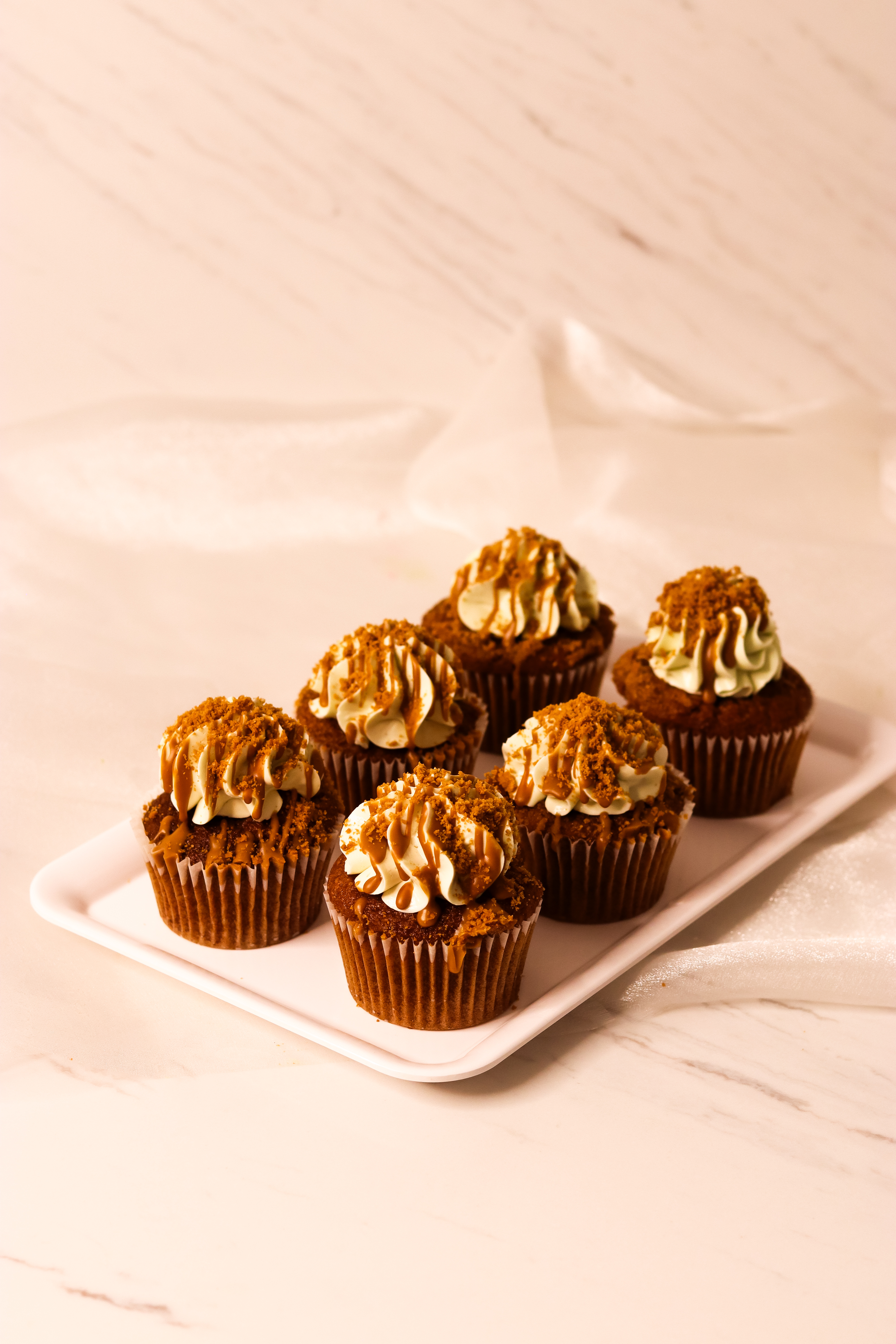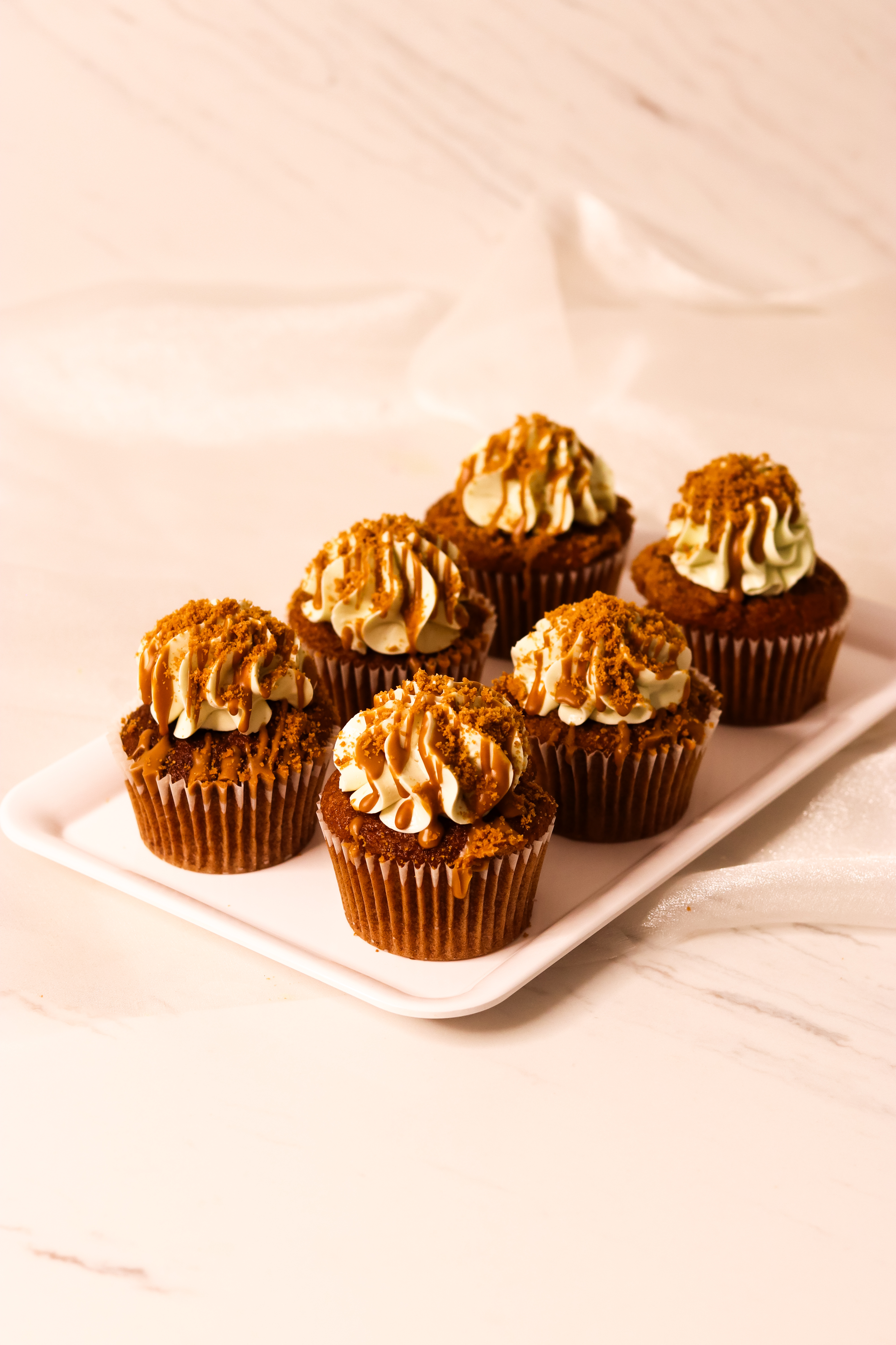 Experience the irresistible combination of caramelized biscuit flavor in our Lotus Biscoff Cupcakes. Moist vanilla cake infused with Biscoff spread, topped with creamy Biscoff frosting and a cookie crumb.