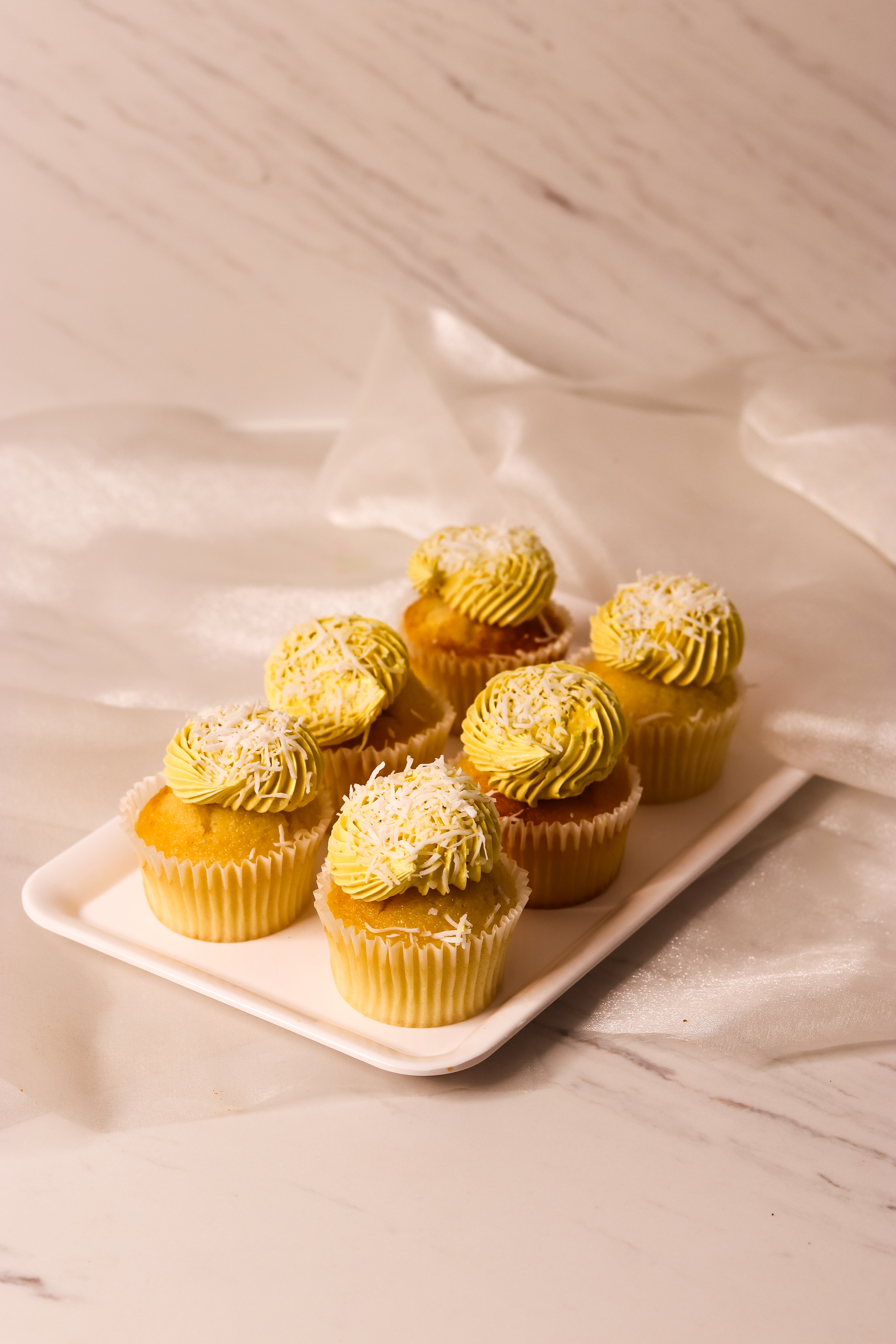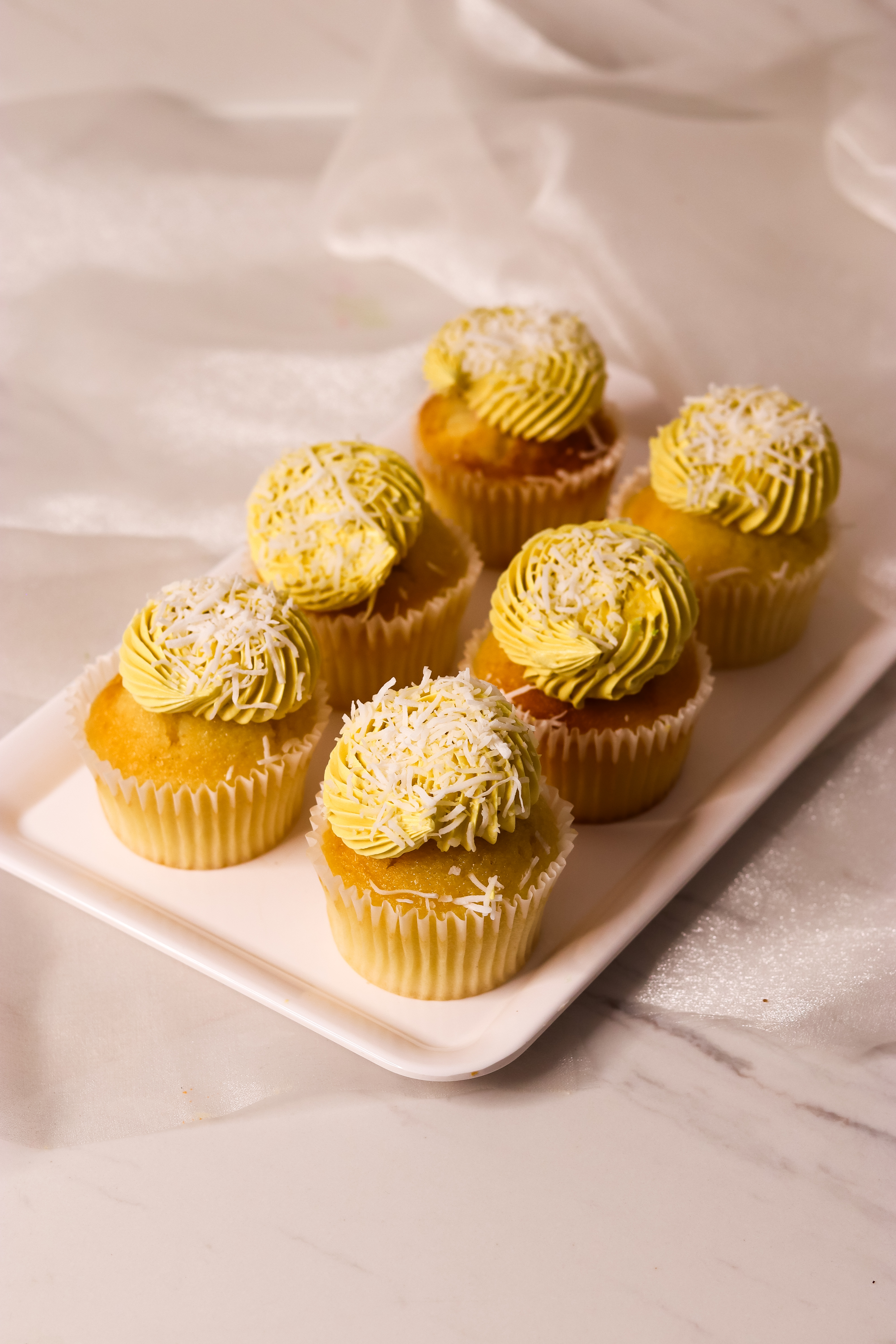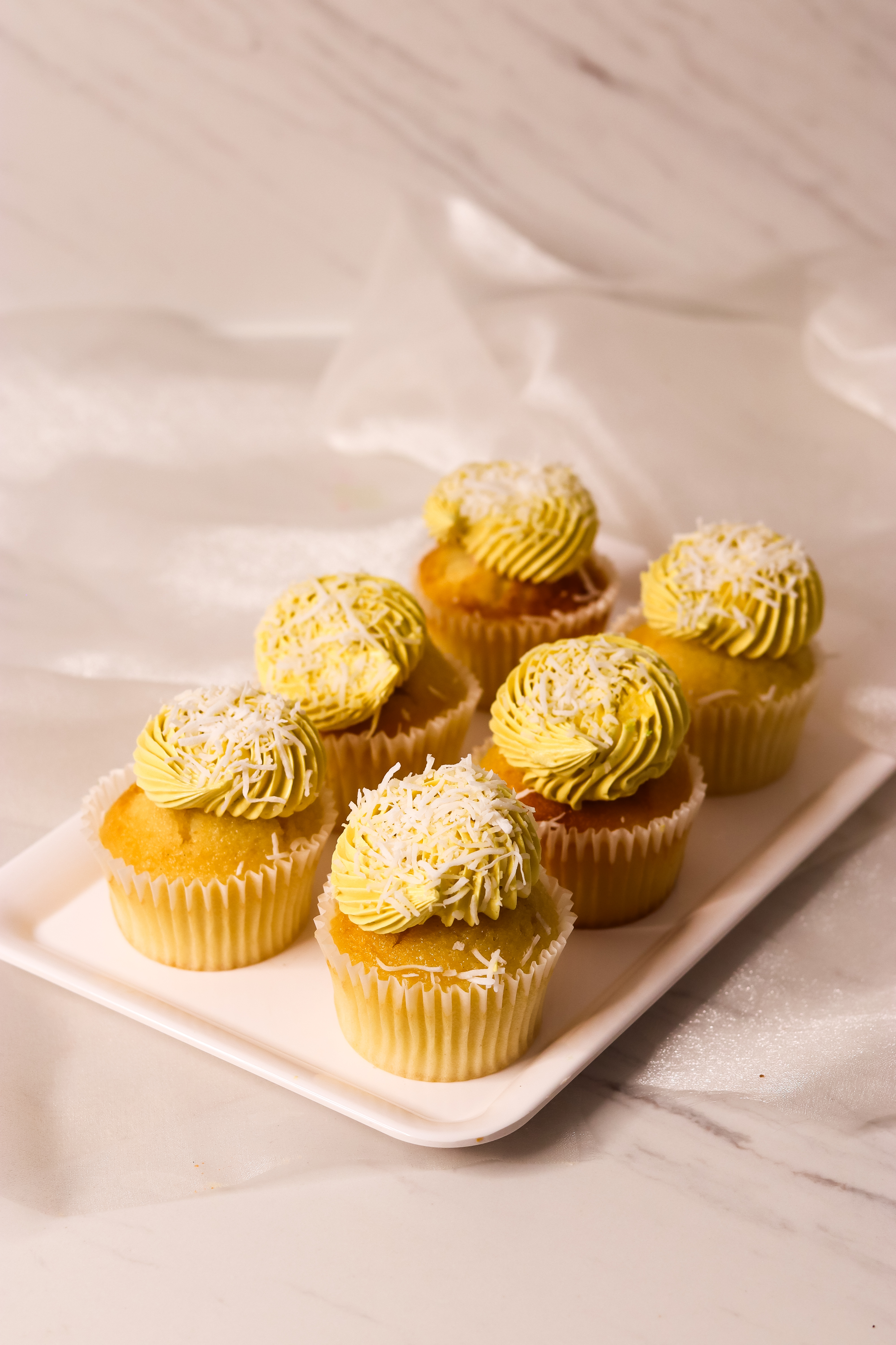 Enjoy our refreshing Mango Raffaello Cupcakes featuring coconut mango cake topped with mango coconut frosting and a Raffaello chocolate.