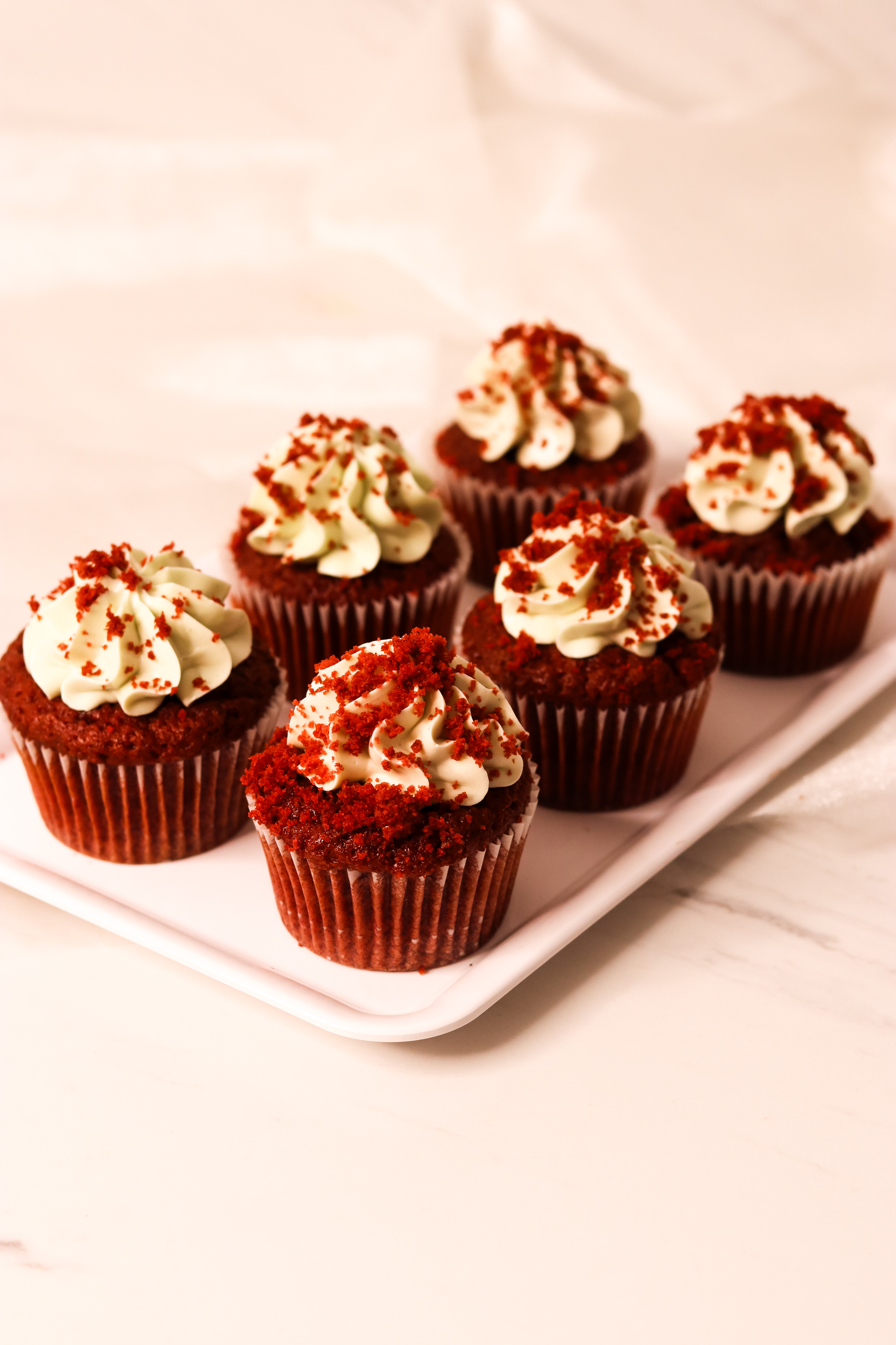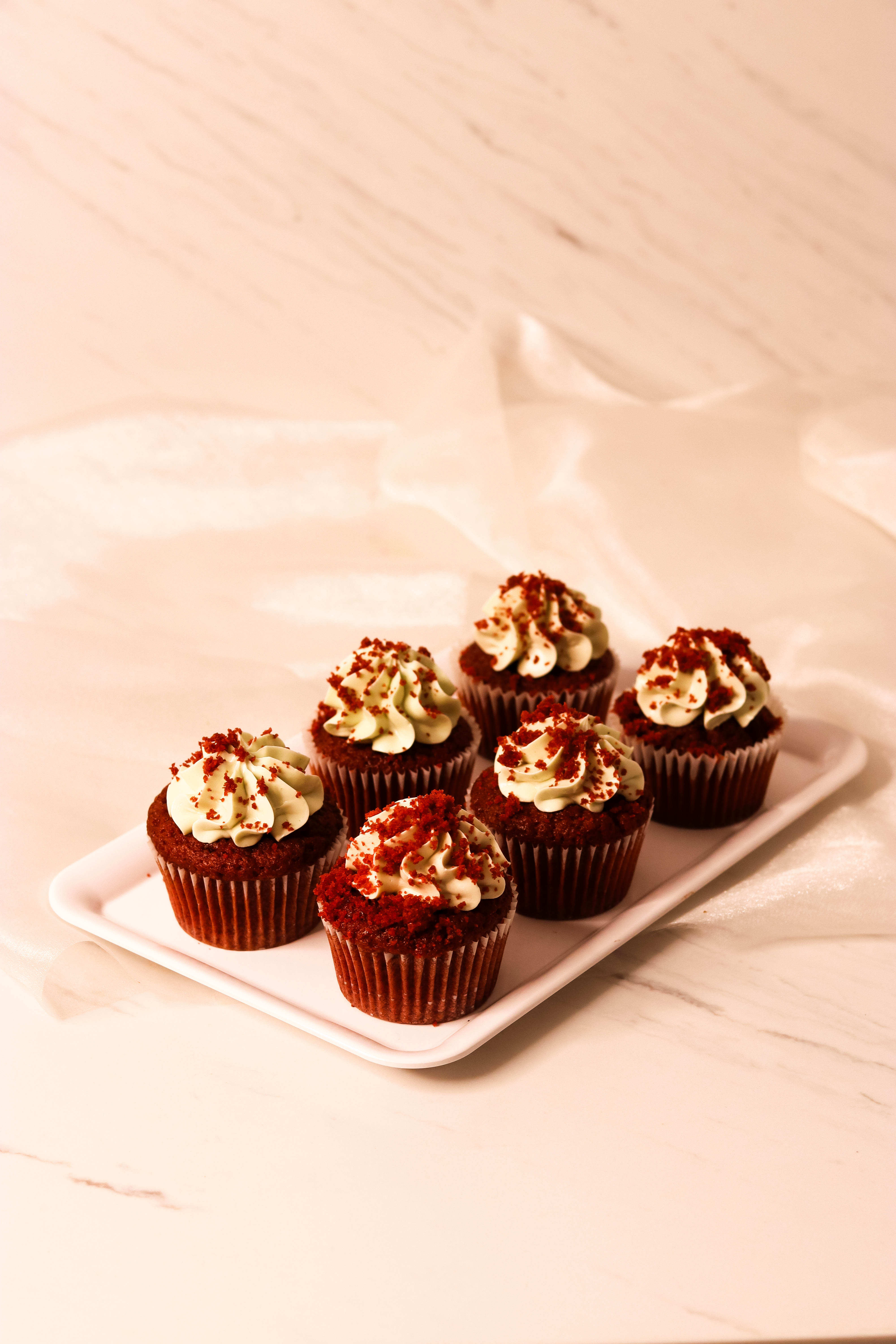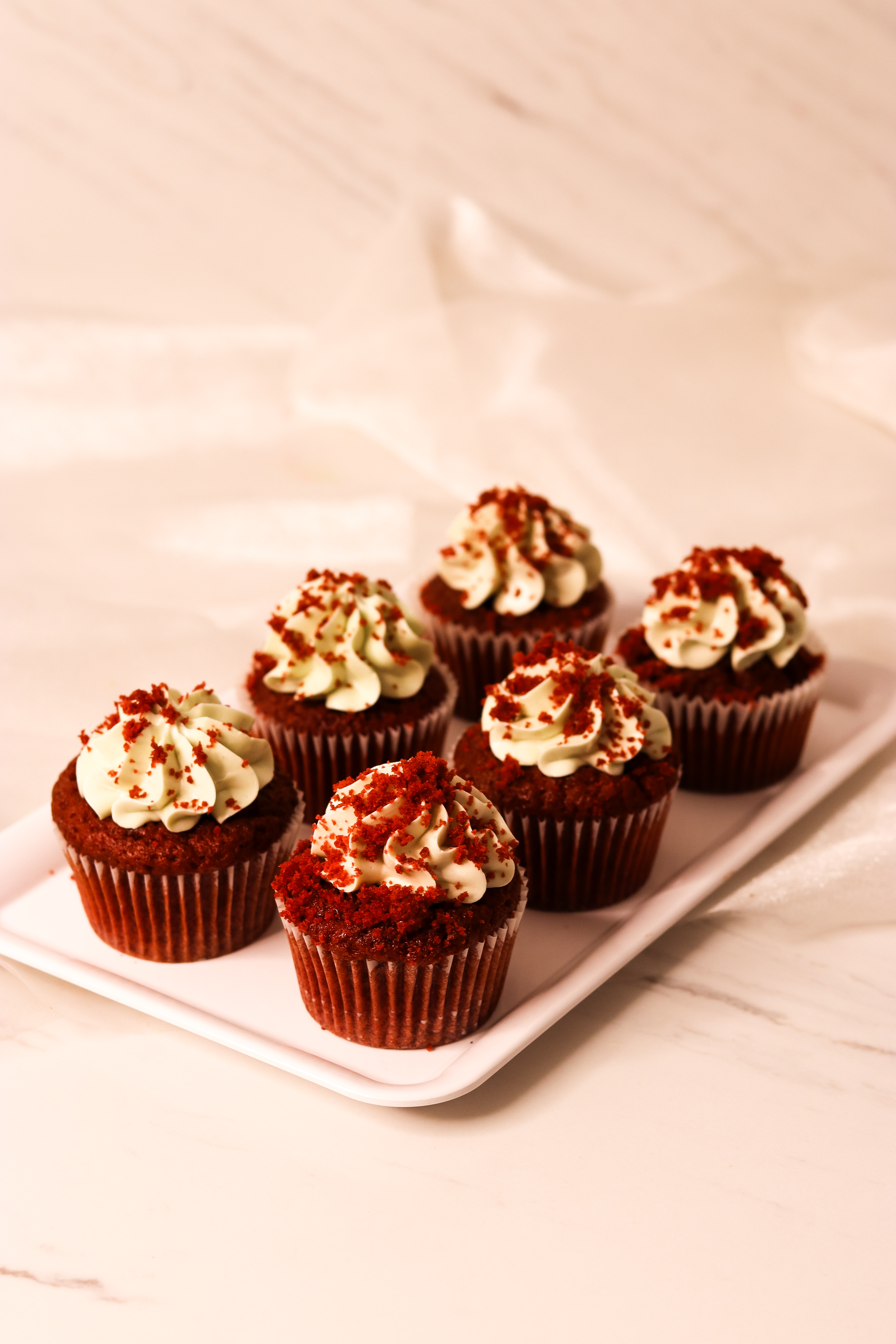 Indulge in our classic Red Velvet Cupcakes featuring moist, velvety cake with a hint of cocoa, topped with rich cream cheese frosting. A timeless favorite that's perfect for any occasion.