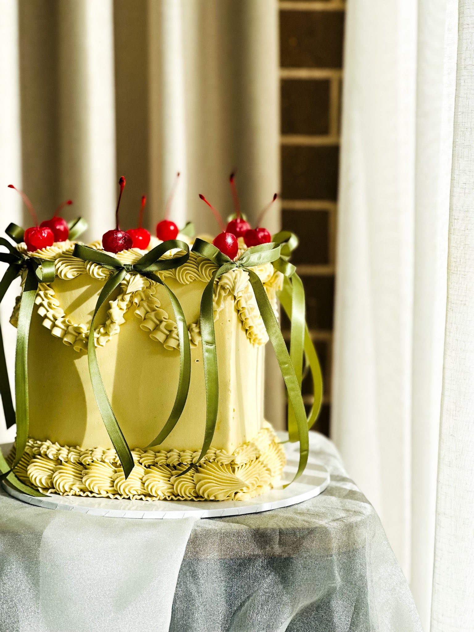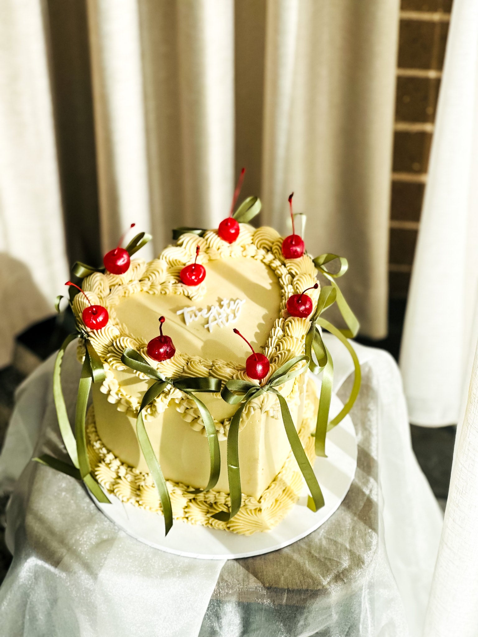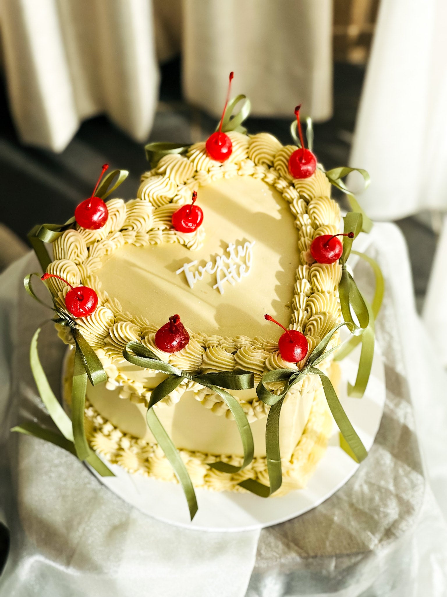 This vintage heart-shaped cake is a delightful centerpiece, featuring three distinct styles of intricate piping that add a touch of elegance and artistry. Adorned with charming bows and garnished with fresh cherries, it presents a classic and sophisticated look.
