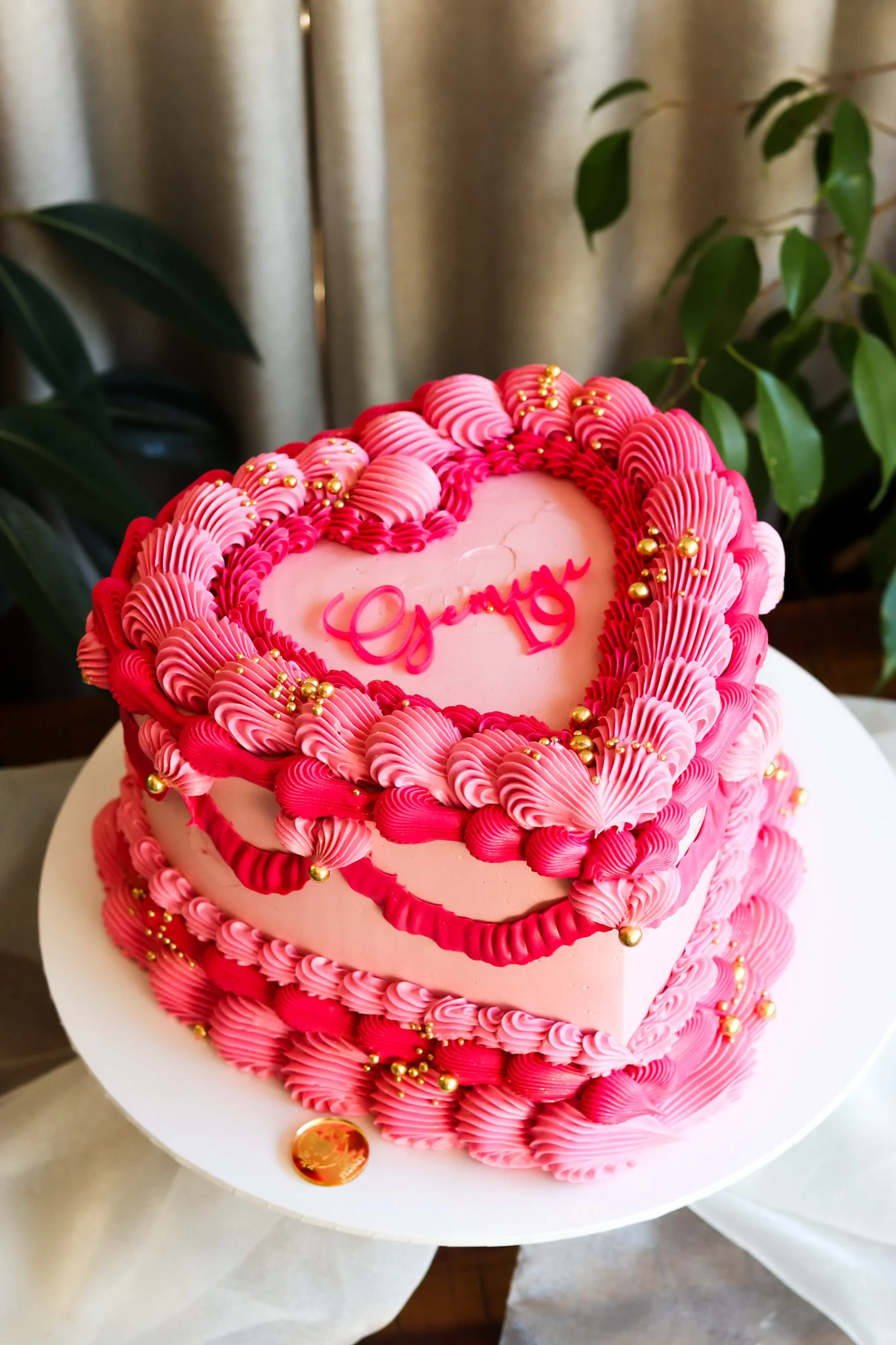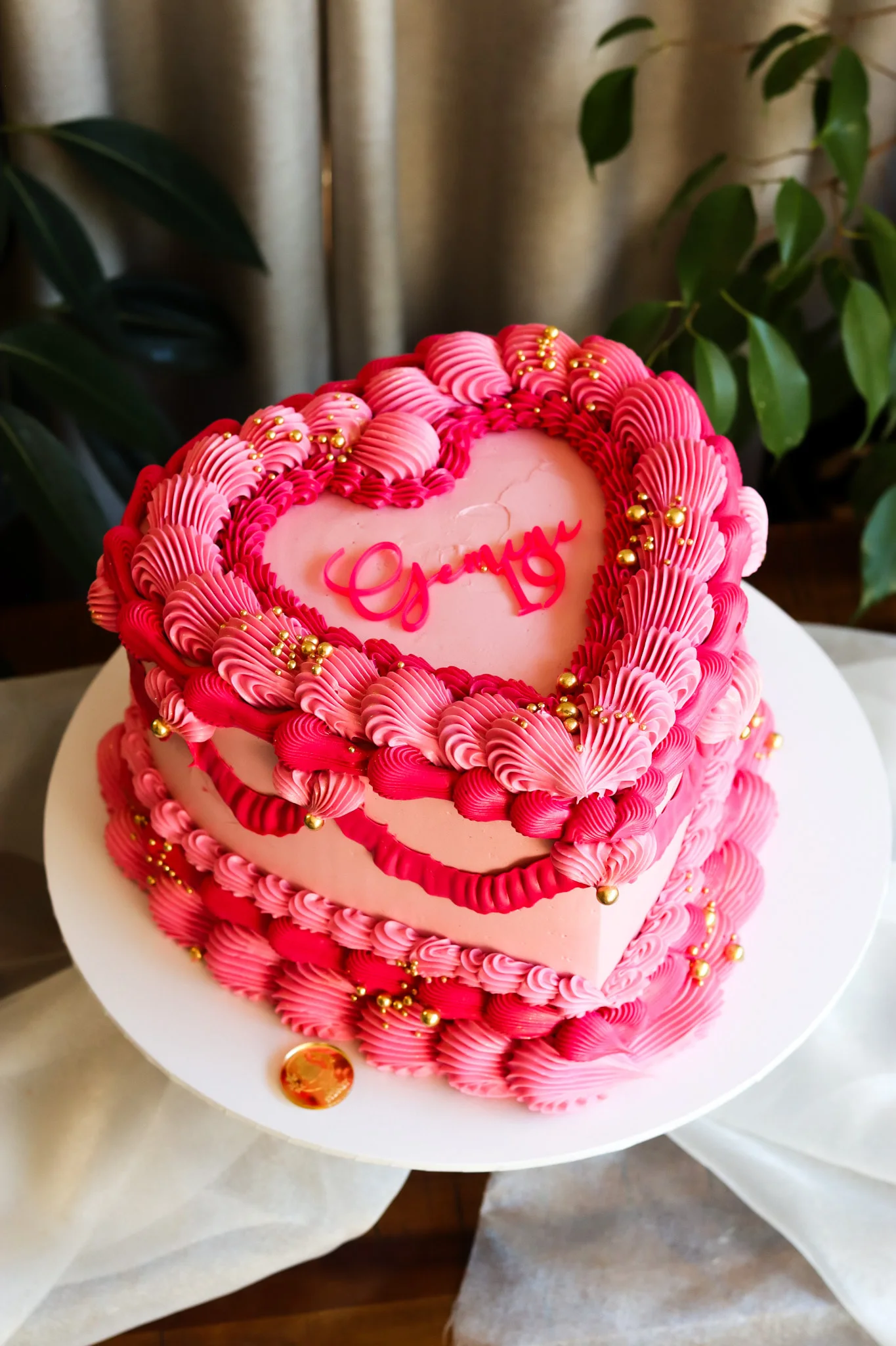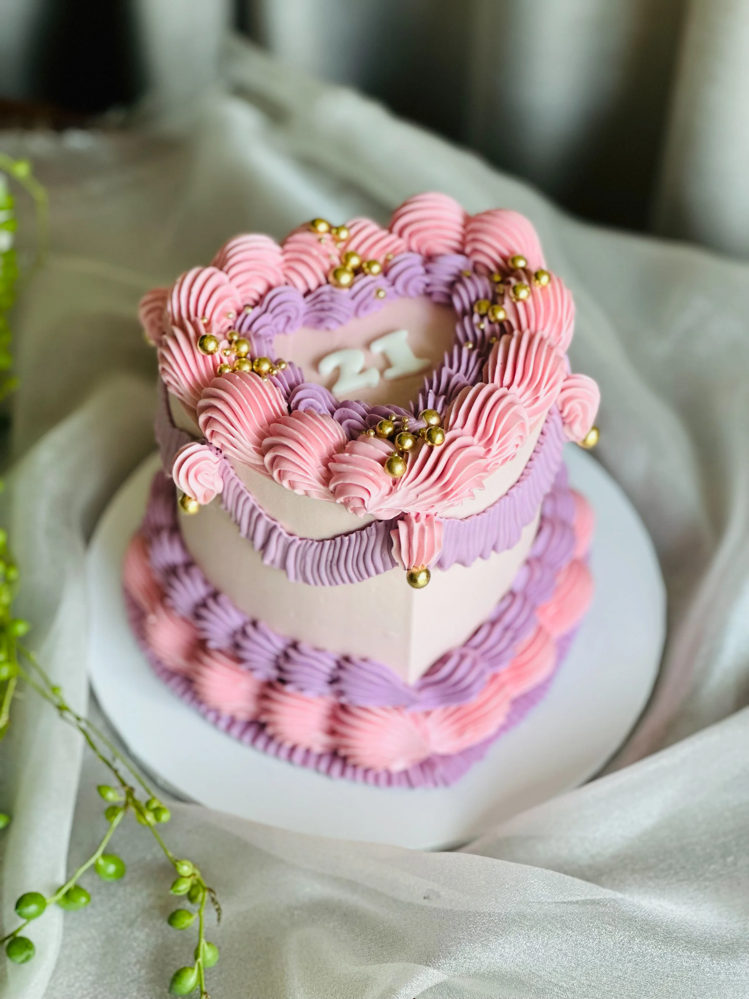 Introducing our enchanting vintage heart-shaped cake, featuring detailed piping, elegant pearls, and a touch of fresh cherries. This design beautifully blends classic charm with a romantic flair.