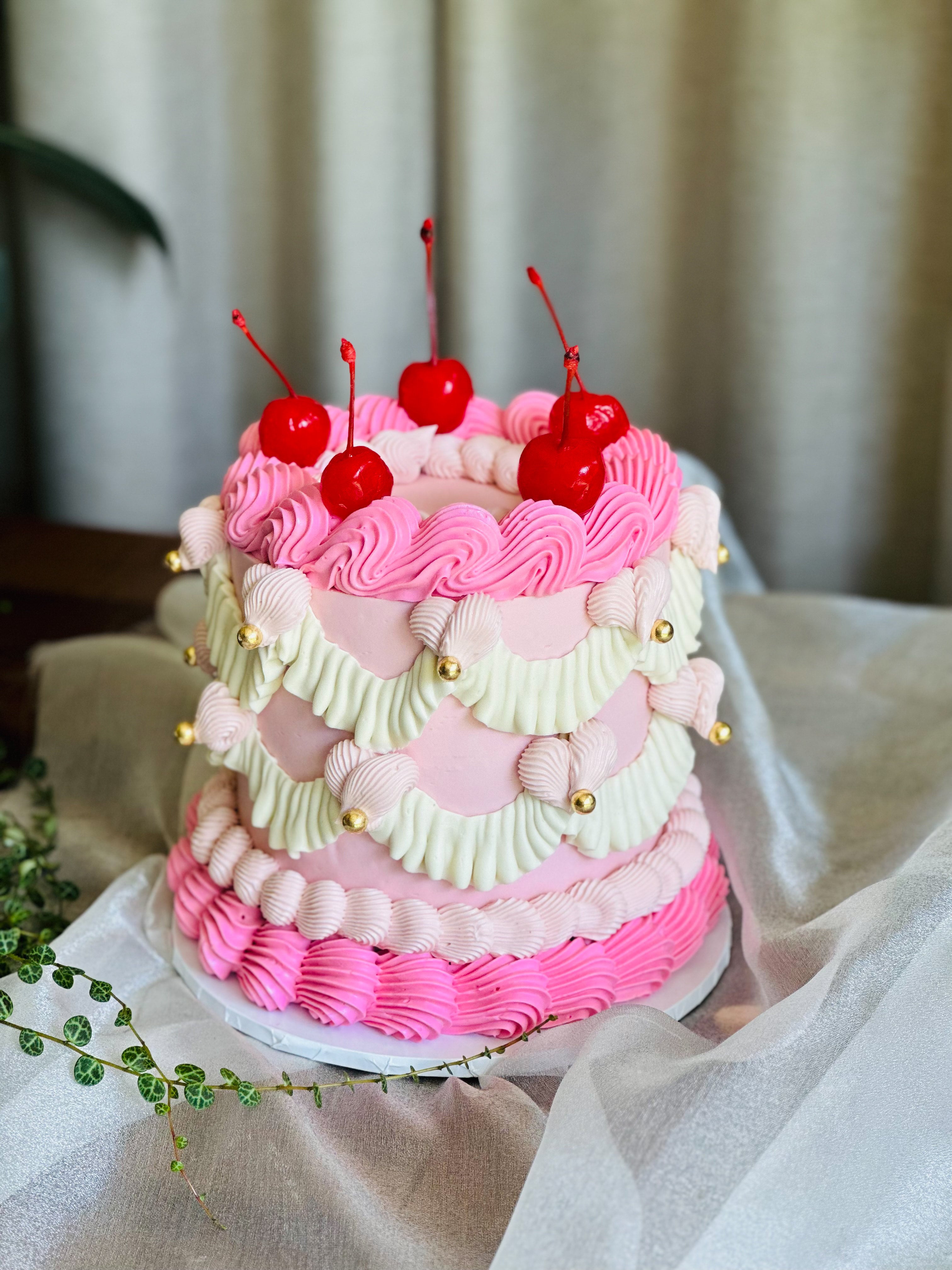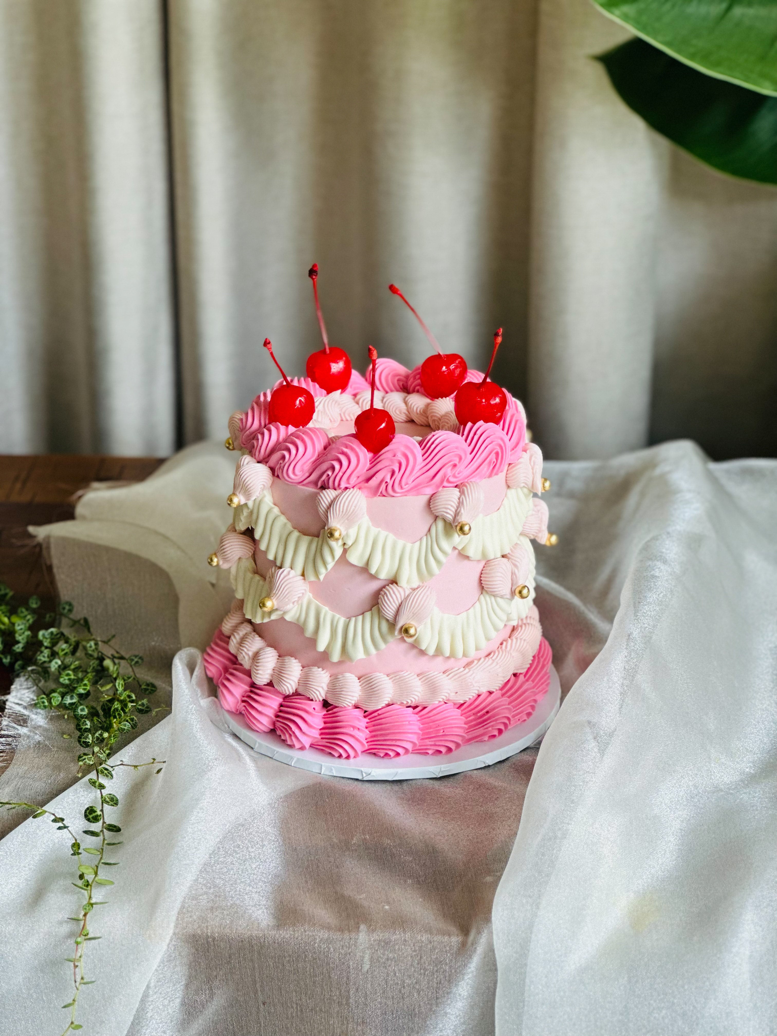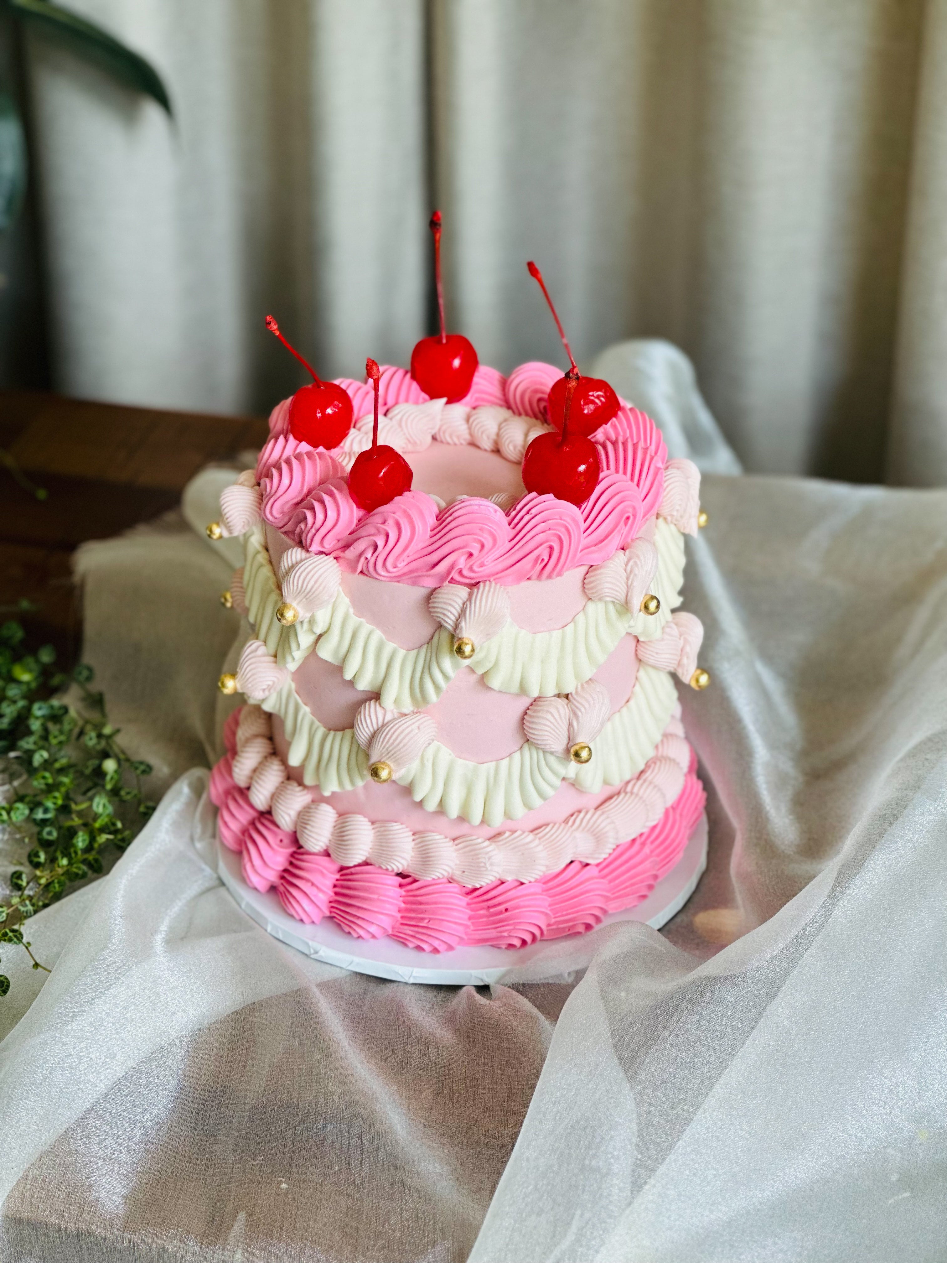 Discover the charm of our vintage-inspired round cake, adorned with intricate piping, elegant pearls, and a touch of fresh cherries. This classic design can be tailored to your preferences with customizable flavours and colours.